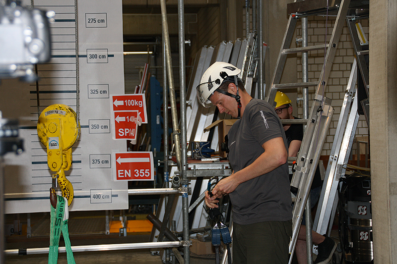 Mit dem Start der Praxistests am Nachmittag wurde klar, warum die Veranstaltung im mehrgeschossigen Praxiszentrum Nürnberg der BG Bau stattfand. Dort ist es indoor möglich, den Sturz vom Baugerüst zu simulieren und anschließend vorzuführen, wie man mit den richtigen Instrumenten einen »Ohnmächtigen« sicher auf den Boden bringt.