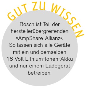 Für eine optimale Handhabung empfiehlt Bosch den Einsatz des 4,0 Ah-Akkus. Dieser schließt unten bündig mit dem Gehäuse des Bohrhammers ab, sodass sich das Gerät bequem abstellen lässt. Außerdem bietet Bosch Professional umfangreiches Zubehör an. Das »Professional 18V System« deckt zudem alle weiteren Einsatzgebiete mit 18 Volt Akkupower ab. Die herstellerübergreifende »AmpShare-Allianz« geht dabei über das Angebot von Bosch hinaus. Viele Marken, viele Maschinen, ein Akku-System: Alle Geräte – vom kompakten Schrauber bis hin zur Kapp- und Gehrungssäge mit vergleichbarer Leistung eines 2 000 Watt-Netzgeräts – lassen sich mit ein und demselben 18 Volt Lithium-Ionen-Akku und nur einem Ladegerät betreiben. Das spart Handwerkern Zeit, Platz und Geld.