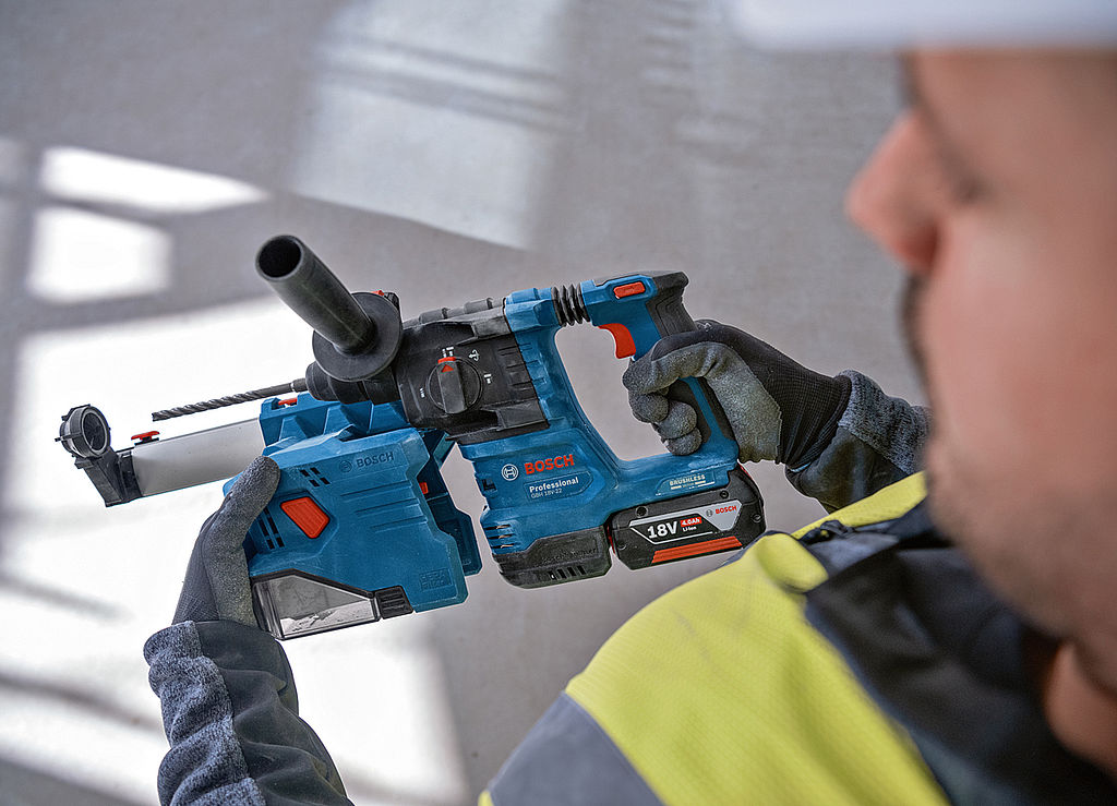 Durch die genau auf den Bohrhammer abgestimmte Staubabsaugung liege auch das Gesamtsystem optimal ausbalanciert in der Hand. So befindet sich der Schwerpunkt des Bohrhammers beispielsweise bei Überkopf-Anwendungen auf einer Achse mit Hand und Arm des Anwenders. Installationen an der Decke können dadurch ergonomisch durchgeführt werden. Außerdem bezieht die Absaugung ihre Energie direkt aus dem Akku des Bohrhammers, sodass Profis bei ihrer Arbeit nicht durch zusätzliches Gewicht belastet werden. Diese Faktoren begünstigen ermüdungsarmes Arbeiten.