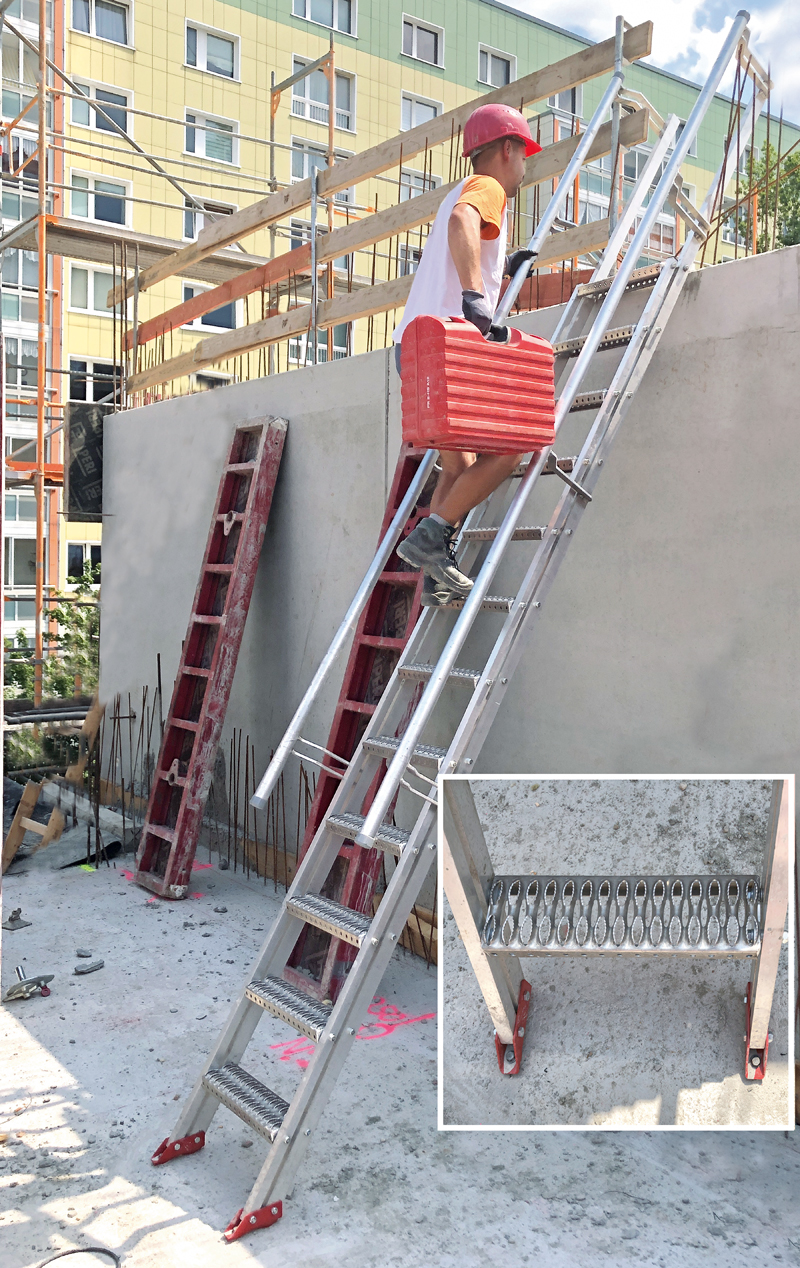 Bei vielen Bauvorhaben bietet der Einsatz von »Stafe« Angaben des Herstellers zufolge in der Praxis handfeste Pluspunkte, wie Alfred Köder, Polier Direktion Stuttgart, Ed. Züblin AG Stuttgart, bestätigt: »Die Sicherheit für alle am Bau Beteiligten steht bei uns an erster Stelle. Daher setzen wir seit mehr als acht Jahren auf die Steiltreppe von Robusta. Die Fakten sprechen für sich: Wir haben seither keine Abstürze mehr zu verzeichnen. Mit dem Handlauf hat man eine oder sogar beide Hände frei für den Transport von Werkzeugen, unterschiedliche Höhen können mühelos überwunden werden. Durch die stets waagerechten Trittflächen hat man immer einen ordentlichen Tritt. Der Clou: Die Steiltreppe ist mehrfach einsetzbar – je mehr wir davon einsetzen, umso besser rechnen sie sich. Normale Leitern bergen diverse Nachteile: Selbst gezimmerte Lösungen mit Holzbrettern sind im Endeffekt teurer und zeitaufwendiger.« Für den Einstieg, so Alfred Köder weiter, müsse umständlich seitlich herumgegangen werden. Außerdem dürfe sie gemäß interner Vorgabe nicht mehr verwendet werden. Alle Nachunternehmer seien durchweg zufrieden, da das Handling einfach sei. J