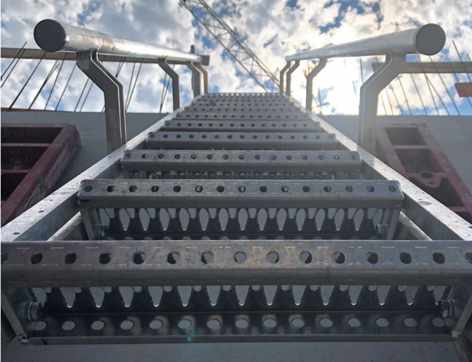 »Die Produkteigenschaften der Steiltreppe machen sich definitiv bezahlt: Überstehende Handläufe (mind. 1 m) ermöglichen den sicheren Ein- und Ausstieg innerhalb der Steiltreppe, die Handläufe sind mit der Steiltreppe fest verbunden für mehr Sicherheit ab dem ersten Schritt. Die Trittstufen stellen sich immer waagerecht ein für optimale Sicherheit – unabhängig von der Neigung. Weitere Vorteile sind die stufenlose Anpassung an verschiedene Raumhöhen, das geringe Eigengewicht durch Aluminium-Konstruktion sowie Stufen aus rutschsicherem Profilrost mit gezahnter Oberfläche (RH R13)«, erläutert Johannes Lißner.