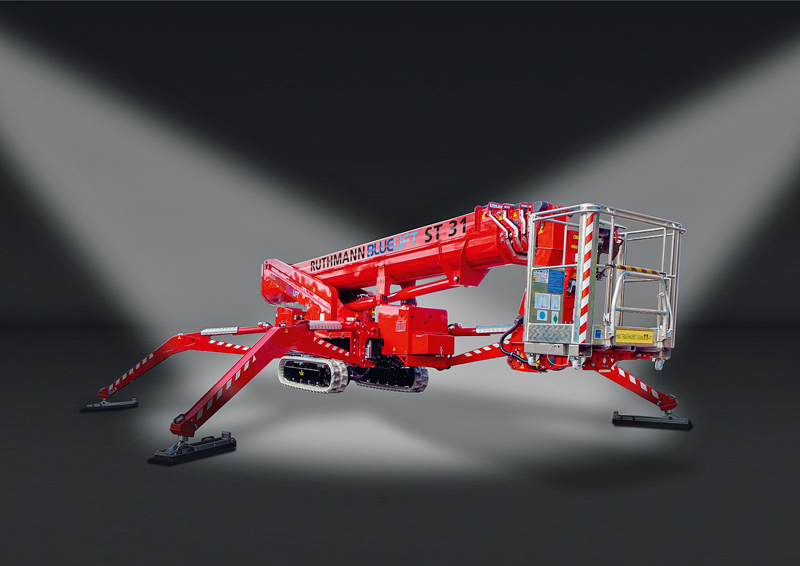 Für ihre Raupenarbeitsbühne »Bluelift ST 31« kombiniert Ruthmann das »Steiger« Träger- und Teleskopsystem mit einem leistungsstarken Raupen-Fahrwerk. Mit einer Breite von 1,14 m und einer Höhe von 1,99 m sei die Arbeitsbühne darüber hinaus sehr kompakt und könne dementsprechend auch durch sehr schmale Öffnungen an ihren Einsatzort gebracht werden. Für eine hohe Stabilität im Gelände sorgt das Ketten-Fahrwerk, das hydraulisch auf eine Breite von 1,62 m ausgefahren werden kann. In der Länge misst die »Bluelift ST 31« mit montiertem Arbeitskorb 7,80 m; wird dieser abgenommen, reduziert sich die Länge auf 7,46 m. Darüber hinaus bietet sie 18 m seitliche Reichweite bei einer Korblast von rund 100 kg sowie 14 m bei einer maximalen Korblast von 400 kg.