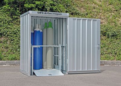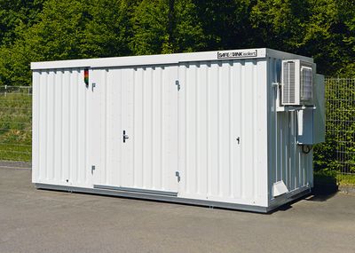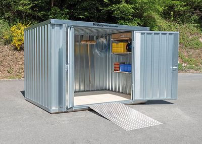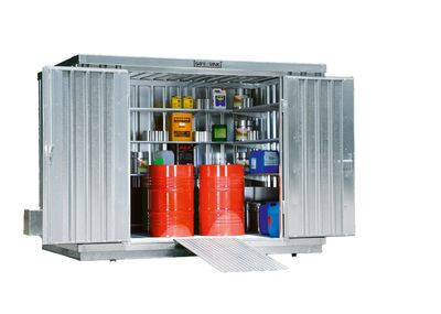 Die StawaR-geprüften Auffangwannen fangen austretende Flüssigkeiten auf und verhindern das Eindringen in Boden oder Grundwasser. Damit erfüllen sie die Anforderungen nach TRGS 510, WHG und AwSV. Passende Modelle sind auch in fahrbarer Ausführung für den mobilen Einsatz erhältlich. Auch die Lager lassen sich flexibel aufstellen und bei Bedarf problemlos versetzen – ohne aufwendige Fundamentarbeiten. So punkten die »Safe Master«-Depots mit kompakten und platzsparenden Maßen und sind darüber hinaus mit einem aufklappbaren Dach ausgestattet, das durch Gasdruckdämpfer in Position gehalten wird. Auch größere Container verfügen optional über Gasdruckdämpfer an den Türen, die ein leichtes Handling ermöglichen. Eine strukturierte Innenausstattung schafft Übersicht und Ordnung im Innenraum.