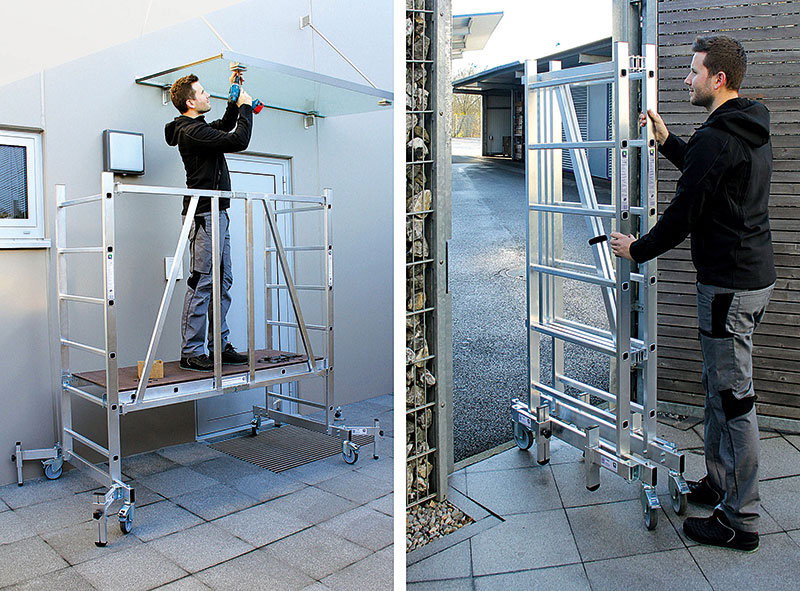 Kleingerüste für Handwerker müssen nicht nur stabil, sondern vor allem auch kompakt und leicht sein. Im Idealfall sind sie, wie das fahrbare »ML«-Gerüst der Günzburger Steigtechnik, als Leiterngerüst konzipiert, damit schnell zur Hand und in Rekordzeit einsatzbereit_ Klapprahmen aufklappen, Standplattform einhängen und schon kann es losgehen. e