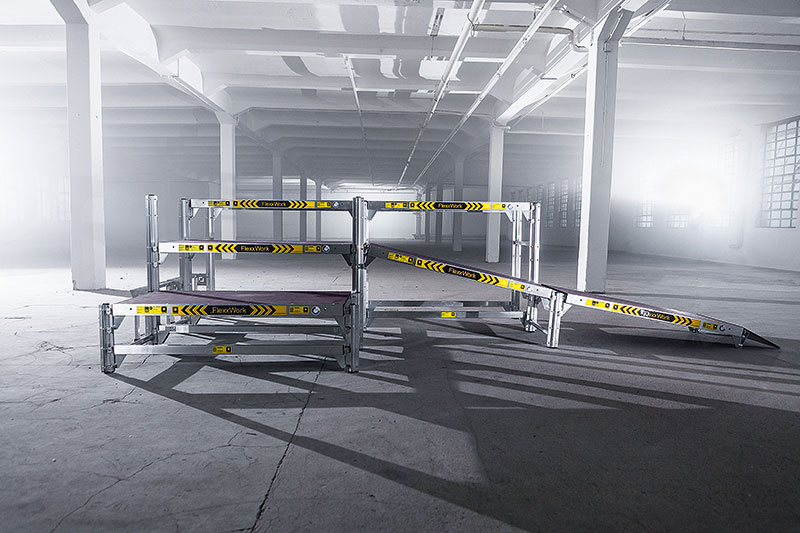 Für Arbeitssicherheit stehen die Profigeräte deutscher Qualitätshersteller, wie zum Beispiel die Leitern, Gerüste und Arbeitsdielen der Günzburger Steigtechnik. Mit der neuen »FlexxWork« hat das Familienunternehmen ein flexibles Arbeitsdielensystem entwickelt, das sich je nach Aufgabe stets neu zusammensetzen und so an die individuelle Herausforderung anpassen lässt. Großflächige Montageflächen sind dabei genauso möglich wie treppenförmige Aufbauvarianten oder Auffahrrampen (die bauSICHERHEIT berichtete bereits in Heft 6/18, Seite 58).