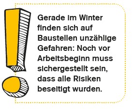Um sicheres Arbeiten im Winter auf Baustellen zu gewährleisten, sollte der Blick des Bauunternehmers in erster Linie auf die Arbeitsstätte an sich gerichtet sein. Zugefrorene Wege, verschneite Arbeitsbereiche oder unzureichende Absicherungen stellen eine unzumutbare Situation für die Beschäftigten dar – sie sind schlichtweg nicht dazu in der Lage, sicher zu arbeiten. Ein Blick auf die Vorgaben, Richtlinien und die Gefährdungsbeurteilung macht schnell deutlich, dass unzureichende Maßnahmen den Betrieb schnell lahmlegen können.