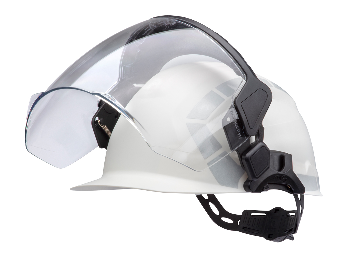 »Wir sind sehr stolz darauf, dass wir für unsere Elektrikerhelme nun ebenfalls ein Visier der Klasse 1 anbieten können. Genau wie bei der PC-Variante gehören die Anti-Scratch und Anti-Fog-Beschichtungen bei uns zum Standard. So bieten die 3-D-geformten und klarsichtigen Visiere von Anfang an eine Sicht frei von Kratzern oder beschlagenen Scheiben«, erklärt Florian Brunk, Bereichsleiter Arbeitsschutz & Feuerwehr.
