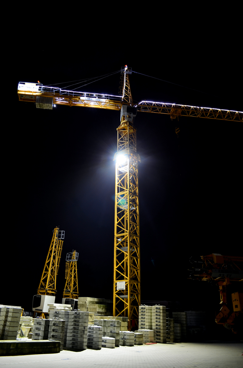 Für die Grundausleuchtung auf Nachtbaustellen setzen viele Bauunternehmungen auf Hochleistungs-Flutlichtstrahler, die an Baukranen montiert werden. Solche Scheinwerfer basieren zumeist auf sogenannter Natrium-Dampf- oder eben auch Halogen-Metalldampf-