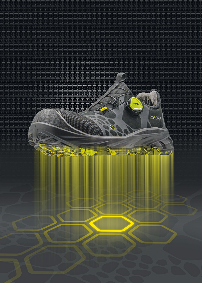 Die neuen Modelle der »Sievi Cobra«-Serie vereinen den Sicherheitsaspekt mit hohem Komfort im Arbeitsalltag. Durch spezielle Leisten und die aus Kompositkunststoff geformte Zehenkappe soll eine fußfreundliche Passform ermöglicht werden. Darüber hinaus sorge die neue, strapazierfähige Antirutschsohle »TractionPro« für optimalen Halt auf jedem Untergrund. Zusätzlich hervorgehoben wird die sich zum Boden hin verbreiternde Laufsohle: Durch dieses Design soll die stoßdämpfende Wirkung auf die tragenden Fußzonen zusätzlich erhöht werden. Zudem wird die Stoßdämpfung durch das elastische »FlexEnergy«-Element, das mehr als 55 Prozent der kinetischen Energie auffängt und an den Bewegungsapparat zurückgibt, maximiert. Auch die integrierte