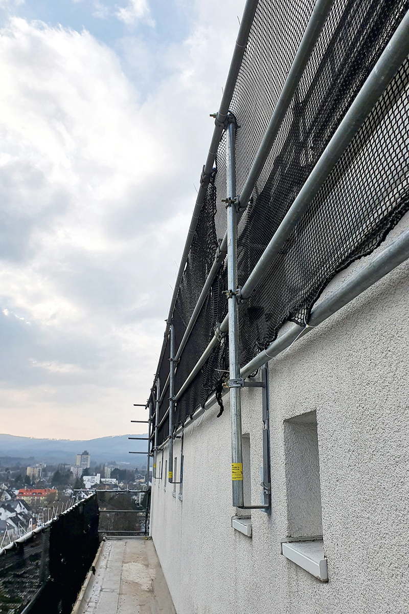 Sowohl aus der Lage als auch der Gegebenheiten durch die Nutzung und technischen Aufbauten des Gebäudes ergaben sich besondere Ansprüche an die zu ergreifenden Sicherungsmaßnahmen. So ist der bewohnte Hochhausbau stark frequentiert, weist beengte Räumlichkeiten um das Objekt herum auf und verfügt über Durchfahrtsbereiche für Anlieger, die auch während der Arbeiten uneingeschränkt nutzbar bleiben sollten. Für die Objektplanungs- und Ingenieurgesellschaft BAI Planung GmbH & Co. KG aus Wiesbaden, die mit der Umsetzung der Leistungsphasen drei bis acht betraut wurde, waren weitere Aspekte zur Ausarbeitung des Sicherungskonzepts ausschlaggebend: »Grundsätzlich ergaben sich allein aus der Gebäudehöhe spezifische Anforderungen. So ist bauaufsichtlich bei der Kategorisierung als Hochhaus ein zweiter Flucht- und Rettungsweg notwendig. Darüber hinaus galt es, die Möglichkeit auftretender starker Winde einzubeziehen und zusätzlich alle Materialien auf der Dachfläche vor dem Herabstürzen zu sichern«, erklärt Johannes Schörfke von der BAI Planung GmbH & Co. KG.