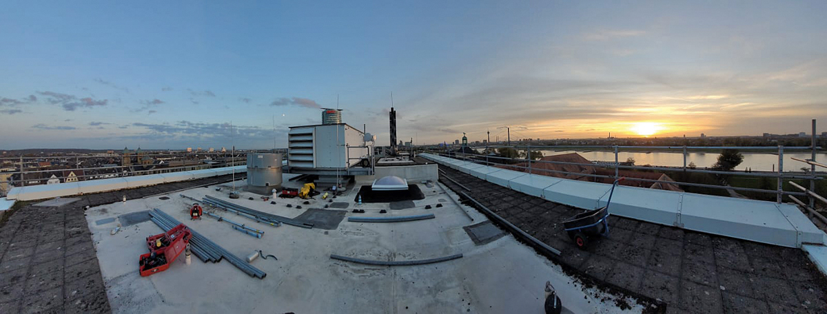 Das 1961 fertiggestellte, in Stahlbeton-Skelettbauweise errichtete Gebäude bildet eine weitreichende Sichtachse und gleichzeitig eine städtebauliche Dominante in Blickrichtung Westen. Bereits im Spätherbst 2022 wurde mit der Dachsanierung begonnen, bei der die Dachfläche energetisch saniert wurde. Die Sanierungsarbeiten begleiteten die Planer und Architekten vom Architekturbüro Christof Gmeiner Architekten BDA, Planungsgesellschaft, Hilden in Zusammenarbeit mit der WSP Deutschland AG. Die besondere Herausforderung bestand hierbei in einer Ausführungsplanung für eine Dachsanierung einschließlich Attikaaufbau, die nach der Sonderbauverordnung/Hochhaus NRW und den Vorgaben des baulichen Brandschutzes sowie der geltenden EnEV und der Tragfähigkeit ausgeführt werden musste.