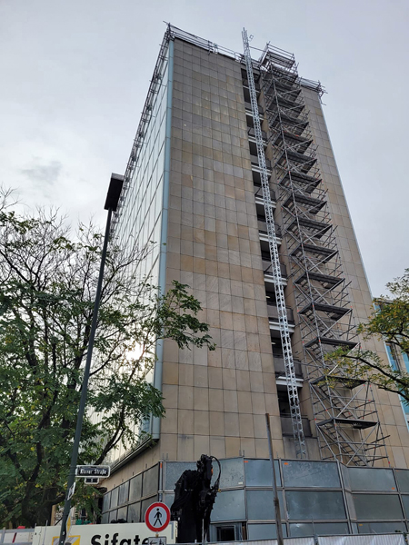 Für die Höhenzugangstechnik des rund 36 m hohen Gebäudes kombinierte Sifatec mit eigenem Montageteam und unter Verwendung persönlicher Schutzausrüstung gegen Absturz (PSAgA) leistungsfähige Geräte zu einem Gesamtsystem. Für den Aufstieg wählte man einen Treppenturm vom Typ »Peri Up Flex«, der seitlich vor der Fassade des Hochhauses aufgestellt wurde. Um die Beförderung von Lasten und Handwerkern schnell und effizient zu ermöglichen, platzierte man zudem einen über Zahnstangen betriebenen Materialaufzug vom Typ »Geda 500Z/ZP«, der sich entweder als reiner Materialaufzug oder als Transportbühne für Personen und Lasten nutzen lässt.