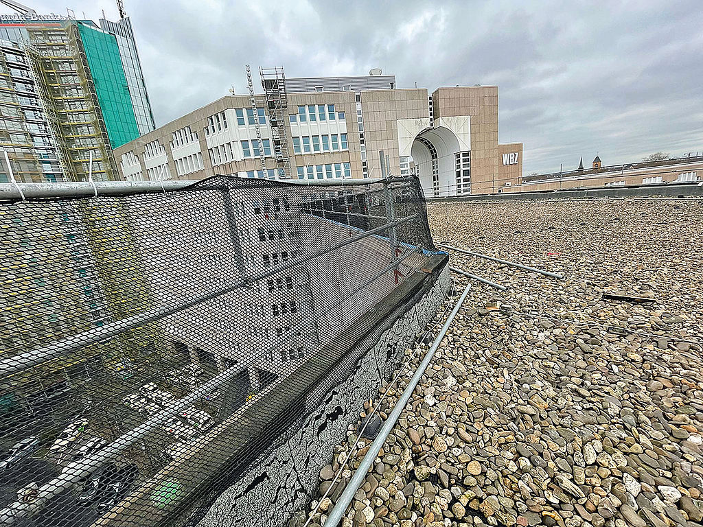 Seit 1987 ist am Standort Ludwig-Erhard-Allee in Düsseldorf das Fachgerichtszentrum Düsseldorf mit Arbeits-, Landesarbeits-, Finanz- und Sozialgericht ansässig. Architektonisch markant ist die mit Granitsteinen verkleidete Fassade, die dem Gebäudekomplex eine hochwertige Optik verleiht. Undichtigkeiten am veralteten Dachaufbau machten die Sanierung der 1 400 m2 großen Fläche erforderlich. Mit der Objektplanung beauftragte der Bauherr, das Bau- und Liegenschaftsamt NRW, die jenga Generalplaner aus Köln. »Es war erforderlich, eine Alternative zur Gesamteinrüstung des Gebäudes zu finden, da ansonsten eine Fläche von circa 7 500 m2 einzurüsten gewesen wäre«, so Geschäftsführer Hubert Wegener über die Anforderung an die Absturzsicherung. Diese sollte trotz der logistisch und baulich beengten Bedingungen angebracht werden können und zu jeder Zeit ein sicheres und einschränkungsfreies Arbeiten ermöglichen. Im Blickpunkt der Planungen stand des Weiteren der Schutz der Naturstein-Fassade vor eventuellen Montage- oder Transportschäden.