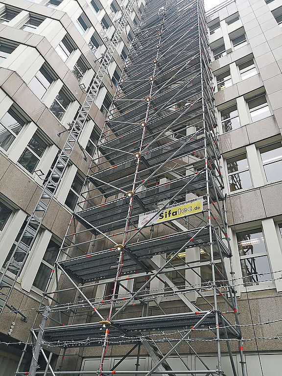 Um für die hochgelegenen Arbeitsplätze einen sicheren Zugang zu gewährleisten, wurde das Gerüstbau-Konzept um einen Treppenturm und einen Bauaufzug aus dem Hause Sifatec ergänzt. Zum einen vereinfachte dies den Materialtransport zur Dachfläche, da dieser über den Innenhof des Fachgerichtszentrums abgewickelt werden musste. Zum anderen diente der Treppenturm den Handwerkern während der Bauphase als Fluchtweg bei drohender Gefahr, zum Beispiel im Falle eines Brandes oder eines Unwetters. Um unbefugtes Betreten zu vermeiden, erhielt die Konstruktion zusätzlich eine Einhausung.