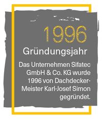 Alles begann mit der Überlegung, das Arbeiten auf dem Dach sicherer zu machen. Der gelernte Dachdecker und spätere Dachdeckermeister Karl-Josef Simon hat wichtige Sicherungslösungen für den Bau vorangetrieben und konnte 1996 mit der Gründung der Sifatec GmbH den Grundstein dafür legen, das Arbeiten auf dem Flachdach für alle weit sicherer zu gestalten.