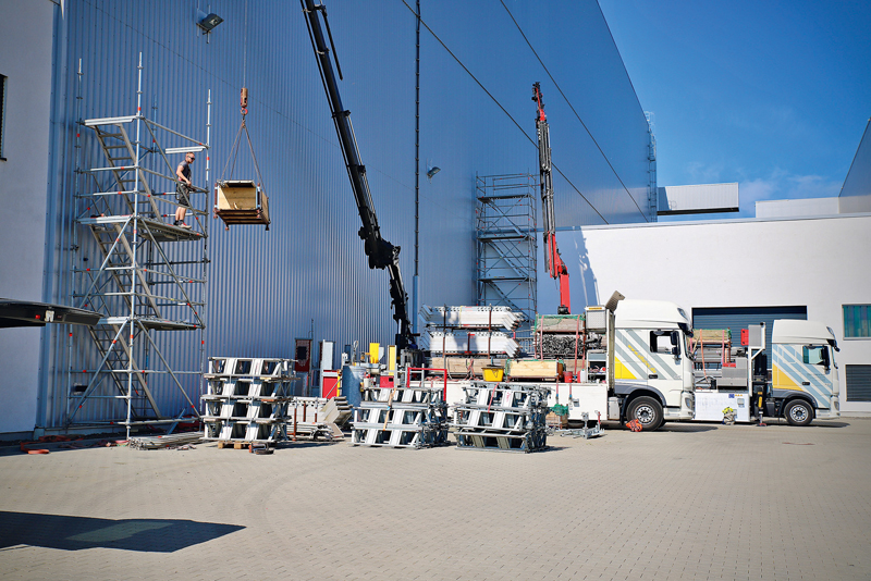 Der erste erstreckte sich über die gesamte Gebäudehöhe von 37 m, gewährleistete zusammen mit einem Aufzug des Typs »Geda 1 500 z/zp« den zügigen Materialtransport und diente zeitgleich als zusätzlicher Fluchtweg. Ein zweiter Turm führte zu einer niedrigeren Dachfläche und wurde als Arbeitsgerüst genutzt. Nach Abschluss der Montagearbeiten durch Sifatec fanden die Verarbeiter alle Voraussetzungen vor, um sicher und effektiv die Photovoltaik-Anlage aufbauen zu können. J