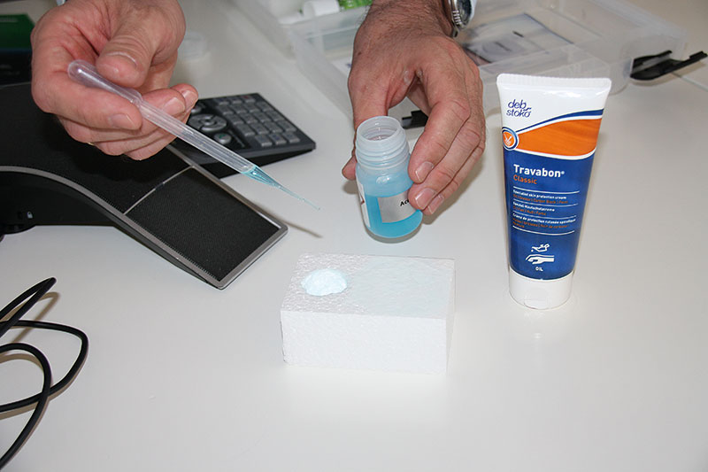Welche Bedeutung die einzelnen Momente haben, demonstriert Wolfgang Röcher an einem simplen Experiment mit einem Klötzchen aus Styropor_ Auf die halbe Oberfläche trägt er »Travabon« auf – ein Klassiker aus dem Sortiment von Deb-Stoko. Die andere Hälfte bleibt unbehandelt. Ein Tropfen Aceton aus einer Pipette richtet auf der vorbehandelten Seite keinerlei Schaden an. Auf der unbehandelten Seite frisst sich das Lösungsmittel sofort ein und hinterlässt ein Loch so groß wie eine Weintraube. »Man kann sich also ausmalen, wie die menschliche Haut es findet, mit Aceton gereinigt zu werden«, sagt Röcher. Dabei wirkt er nicht belehrend, sondern will einfach einen Effekt aufzeigen, der vielen einfach so nicht bewusst ist – und damit das Unsichtbare sichtbar machen.