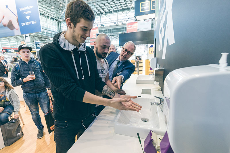 Eine Möglichkeit ist, den Weg zur Wahl des richtigen Produktes zu vereinfachen. Hier setzt Deb-Stoko neben einem Produktfächer, der für jede Berufsgruppe und Anwendung die darauf abgestimmten Produkte nennt, auf digitale Helfer, allen voran eine App_ Sie ist der »Außendienstler für die Tasche« und gibt anhand der Nutzerangaben Tipps, mit welchen Produkten der wirkungsvolle Pflege-Dreiklang zu erreichen ist. »Wir verstehen uns als Partner, um die Hautprobleme des Kunden zu lösen«, erklärt Röcher und weist damit den Weg über das reine Produkt hinaus_ Zum Service des Herstellers gehören auch Trainings mit den bereits beschrieben Versuchen, aber auch das Erstellen von Hautschutzplänen inklusive der geforderten Risikobewertung sowie die Gewinnung von Daten und deren Auswertung bei den »smarten« Spendersystemen.
