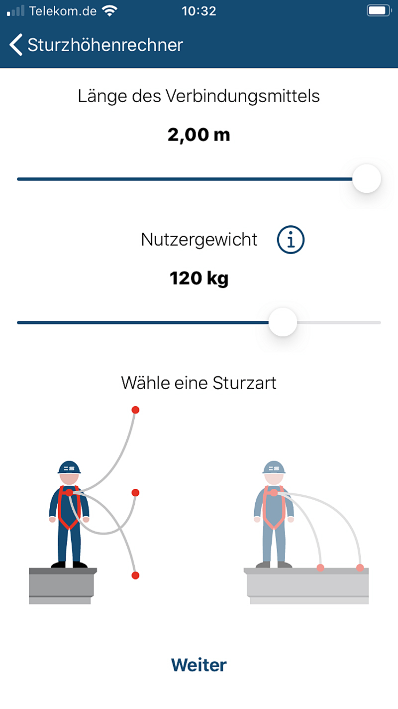 Jeder, der auf dem Gerüst, im Hochregal oder an einer anderen exponierten Stelle arbeitet, muss sicherstellen, dass die Persönliche Schutzausrüstung gegen Absturz (PSAgA) so ausgewählt und befestigt ist, dass sie den Anwender im Falle eines Falles sicher auffängt. Um die Sturzhöhe zu ermitteln, also die benötigte Strecke unterhalb des Anschlagpunktes, muss man eine Reihe von Parametern in Relation setzen: Lage des Anschlagpunktes, Länge des Verbindungsmittels, Gewicht des Anwenders, Länge des freien Falls und schließlich das Aufreißen des Falldämpfers. Die Addition schafft man zwar ohne Matheabitur, aber trotzdem bleibt es kein leichtes Unterfangen zwischen rotierendem Betonmischer und kreischender Flex auf der Baustelle.