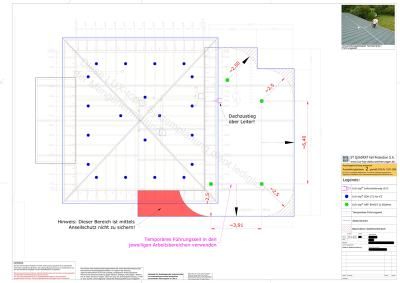 Eine frühzeitige Berücksichtigung der Absturzsicherung im Zuge der Planung des Gebäudes unter Betrachtung aller betroffenen Gewerke ist unumgänglich, um Schnittstellen-Problematiken zwischen den Gewerken zu reduzieren und die Ausführung eines sicher nutzbaren, praxistauglichen Absturzsicherungssystems zu gewährleisten. Hier sind also die Architekten, aber auch sonstige an der Planung Beteiligten gefordert, die Absturzsicherung in die Planung zu integrieren. Das Planungsteam von ST Quadrat Fall Protection steht beispielsweise täglich vor neuen Herausforderungen, um den beauftragten Verarbeitern die für die Montage erforderliche Ausführungsplanung der Absturzsicherungssysteme auf Basis der Architektenplanung zu erstellen. Aber auch während der Planungsphase unterstützt der Profi die Architekten mit Rat und Tat bei komplexen Fragestellungen. Von der Machbarkeitsprüfung hinsichtlich Befestigungsmöglichkeiten der Systeme bis hin zur Unterstützung mit Ausschreibungstexten als auch Hilfestellung in Planungsfragen ist ein breites Leistungsspektrum gegeben.