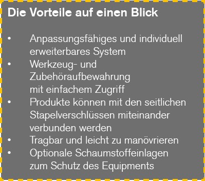 Da »Pro-Stack« so konstruiert ist, dass es sich nahtlos in verschiedenen Konfigurationen zusammenfügen lässt, verfügt das System über robuste seitliche Stapelverschlüsse, um Einheiten sicher miteinander zu verbinden. So werden der Transport in einem Lieferwagen, das Rollen zwischen verschiedenen Standorten oder das Tragen von Hand erleichtert. Darüber hinaus sind verschiedene mobile Optionen erhältlich, darunter ein »Pro-Stack«-Cart und ein »Pro-Stack«-Trolley. Eine mobile Aufbewahrungsbox mit integrierten Rädern bietet weitere Flexibilität.