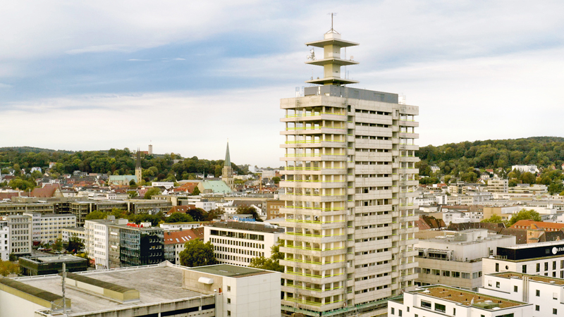 Das ehemalige Telekom-Hochhaus in Bielefeld stellt mit seinen 18 aufgehenden Etagen und einem zusätzlichen Antennenturm das höchste Gebäude der Stadt dar. 2018 hat das Bauunternehmen Goldbeck das Hochhaus erworben und von Grund auf saniert. Nach einer umfassenden Entkernung soll die Fassade bis Ende 2021 fertig montiert werden. Sowohl während der Entkernungsarbeiten als auch bei der Fassadendemontage hat sich das Bauunternehmen für den Einsatz des »SideXafe«-Systems von Strenge entschieden. Grund dafür war laut Kristina Meier-Redecker, Bauleiterin bei Goldbeck, vor allem die einfache Handhabung und die hohe Zuverlässigkeit. »In der Vorbereitung haben wir uns viele Gedanken zum Arbeitsschutz und im Speziellen der Absturzsicherung für die Fassadenarbeiten gemacht«, so die Dipl.-Bauingenieurin. »Bei der Suche nach einem passendem System sind wir bei unserem langjährigen Partner, der Firma Strenge, mit dem SideXafe-System fündig geworden und waren schnell von dem System überzeugt.«