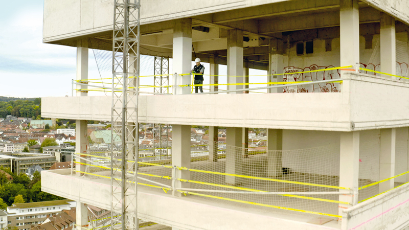 Punkten konnte das System laut Bauleitung bisher in erster Linie durch den schnellen und einfachen Aufbau an der vorhandenen Betonkonstruktion im gesicherten Bereich, bevor die alte Fassade demontiert wurde. »Dazu kommen die hohe Flexibilität mit Feldlängen von bis zu 9 m und die problemlose Erweiterbarkeit, was für uns ausschlaggebende Punkte waren«, so die Expertin. »Zudem können wir mit dem System während der gesamten Fassadenarbeiten die notwendige Absturzsicherung sicherstellen.« Überdies stand das Thema Nachhaltigkeit im Mittelpunkt: »Auch nach Abschluss der Fassadenarbeiten am Hochhaus war und ist das System bei weiteren Projekten wieder einsatzfähig.«
