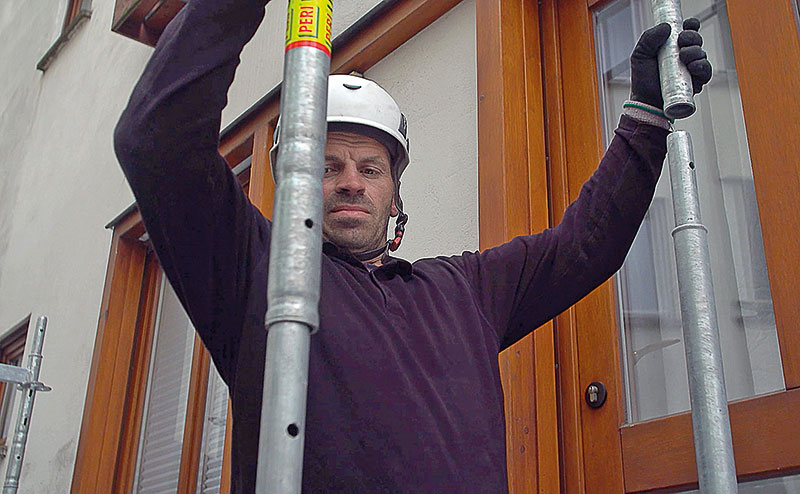 Bei der Sicherheitstechnik verfolgt der konstruktive Aufbau des »Peri Up«-Gerüstsystems einem Prinzip aus dem modernen Geräte-, Maschinen- und Anlagenbau, das eindeutige Parallelen zu dem Top-Modell des Arbeitsschutzgesetzes aufweist_ Sicherheitsprobleme sollen wo und wann immer möglich direkt an der Gefahrenquelle gelöst werden. Deshalb haben technische Sicherheitsmaßnahmen Vorrang vor organisatorischen oder persönlichen Schutzmaßnahmen. Drei sicherheitstechnische Aspekte standen bei der Entwicklung im Vordergrund, da bei ihnen konstruktive Schwächen schnell zu Unfällen oder Gesundheitsschäden führen können: das Bauteilgewicht, der Seitenschutz und die Gerüstbeläge. So erreicht das Fassadengerüst »Peri Up Easy« durch hochfeste Stähle und angepasste, unterschiedlich gestaltete Bauteilprofile Gewichtsvorteile, die das Personal bei Montageund Demontage stark entlasten. Das schwerste Rahmenbauteil für die Systembreite 100 cm wiegt 12,5 kg, alle anderen Bauteile mit Ausnahme des großformatigen einteiligen Kombibelags sind nochmals leichter. Unter Sicherheitsaspekten noch wichtiger ist die grundsätzlich vorlaufende Montage der nächsthöheren Gerüstebene aus der schon sicheren darunterliegenden Ebene, und zwar einschließlich aller Absturzsicherungen wie Horizontal- und Stirngeländer. Hilfskonstruktionen, die sonst als zusätzliche Sicherheitskomponenten eingebaut werden müssen und bei Aufbau und Überwachung Arbeitszeit kosten, können entfallen. Gleiches gilt für die PSA gegen Absturz, die in Vorbereitung und Anwendung besondere Sorgfalt erfordert. Bei »Peri Up Easy« wird die höhere Gerüstebene erst betreten, wenn Belag und Geländer schon montiert sind.