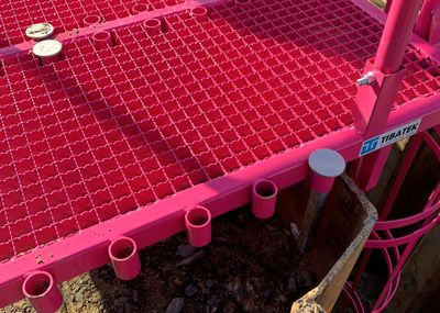 Die von Tibatek entwickelte Absturzsicherung wird auf einer eigens entwickelten Pfostenpalette, auf der sich 16 einzelne Stahlpfosten befinden, angeliefert. Die Elemente sind vertikal in unterschiedlichen Höhen angeordnet. Jeder Geländerpfosten kann dabei einzeln durch eine Baggerschaufel oder einen Greifer entnommen werden. Der Geländerpfosten wird anschließend direkt durch den Bagger senkrecht in den Boden an der Baugrube gedrückt. Der Boden muss lediglich ausreichend befestigt sein – dafür muss der jeweilige Anwender natürlich insbesondere gesorgt haben.