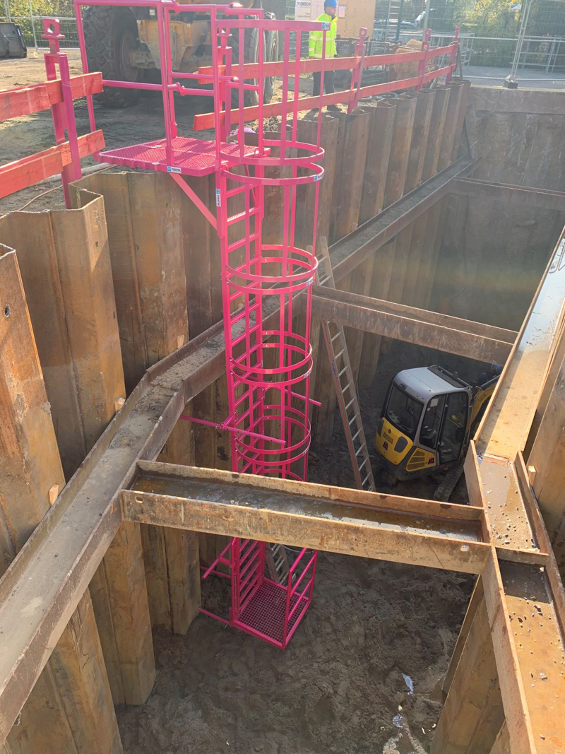 Die Spundwandleiter kann nicht nur einfach aufgebaut werden, ein weiterer wirtschaftlicher Vorteil zeigt sich dadurch, dass die Leiter ganz einfach mit einem Bagger an die Spundwand gehängt wird. An der Einsatzstelle muss kein zeitaufwendiges Auf- bzw. Abbauen eines Treppenturms vorgenommen werden. Ebenfalls wird es überflüssig, dass ein Personen-Arbeitskorb eingesetzt wird, um das Baustellenpersonal in die Baugrube abzulassen. J