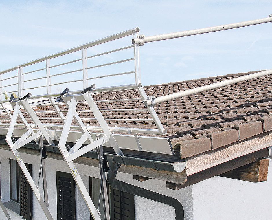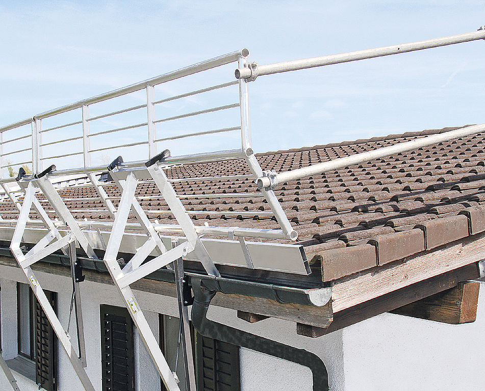 Am Dach setzt Tobler auf die Schlagwörter Leichtbau und Logistik. So sollen Erweiterungen und der Giebelanschluss bei den neuen leichten Integralkonsolen mit Traufgittern aus Rundrohr besonders einfach sein. Darüber hinaus verursachen sie keine Beschädigungen an der Hauswand und sind mittels Bordbrettmontage einfach und schnell aufgebaut. Auch die Alu-Sparrenzangen für den Ortgang sind über Schlagschrauber in kurzer Zeit montiert, wie Tobler erläutert. Mit der neuen Firstkonsole bietet das Unternehmen darüber hinaus ein Produkt, das schnell unter einem Dachziegel eingehängt werden kann, ohne dass der Ziegel dafür zerstört werden muss.