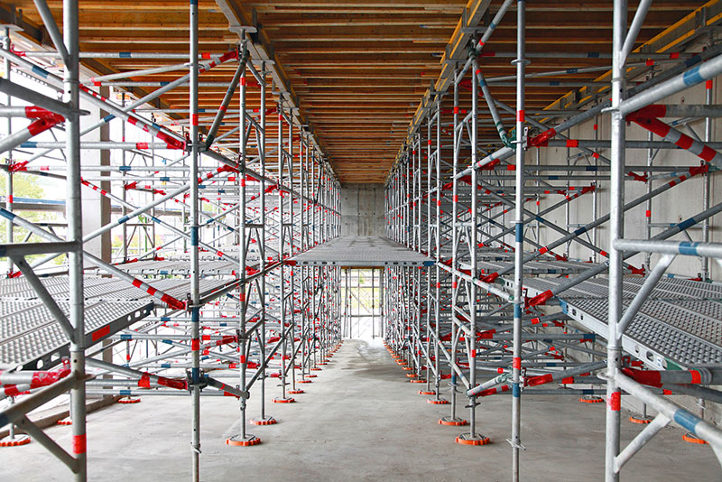 Vorteile, die für das Bauunternehmen Karl Köhler aus Besigheim (Baden-Württemberg) beim Bau der Auffahrtsrampe für ein neues Parkhaus zum Tragen kamen. Hier musste ein bis zu 7 m hohes Traggerüst als Unterstützung für die Deckenschalung inklusive Arbeitsebene errichtet werden. »Wir setzen das ›Allround‹-System ein, weil uns die Kombinierbarkeit, Flexibilität und Sicherheit des Materials überzeugt. Ein echtes ›Allround‹-Talent eben«, so Geschäftsführer Horst Köhler.