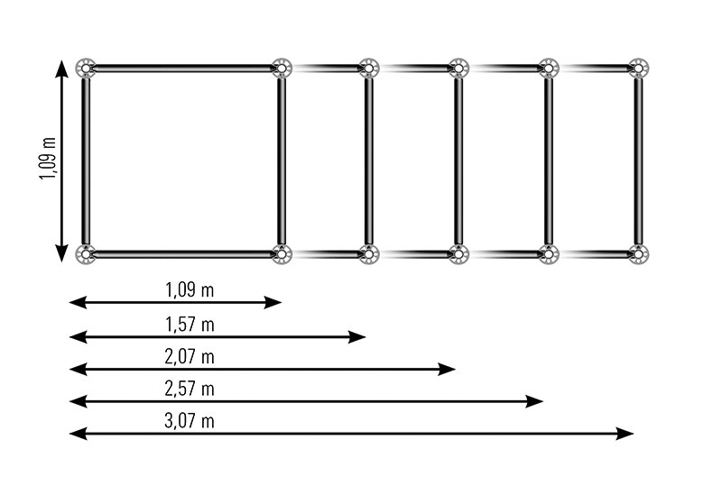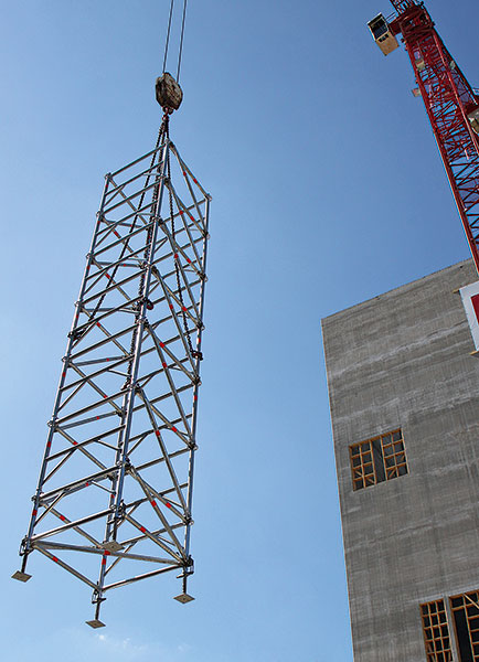 Müssen nur kleine Flächenlasten abgetragen werden, kann der quadratische Grundaufbau der »Allround«-Traggerüsttürme »TG 60« außerdem durch die verschiedenen Standardlängen der »Allround«-Riegel und -Diagonalen flexibel bis 3,7 m gestreckt und damit an die gegebene Flächenlast angepasst werden – mit dem Ergebnis einer effizienteren Stielausnutzung im Turm. Auf diese Weise sind weniger Traggerüsttürme nötig. »Das Traggerüst ›TG 60‹ ist kein starres Turmsystem, sondern ein hochflexibles Gerüst, das variabel an die Schalungskonstruktion oder an die Belastung mittels Streckung der Feldlängen angepasst werden kann«, betont Köhler.