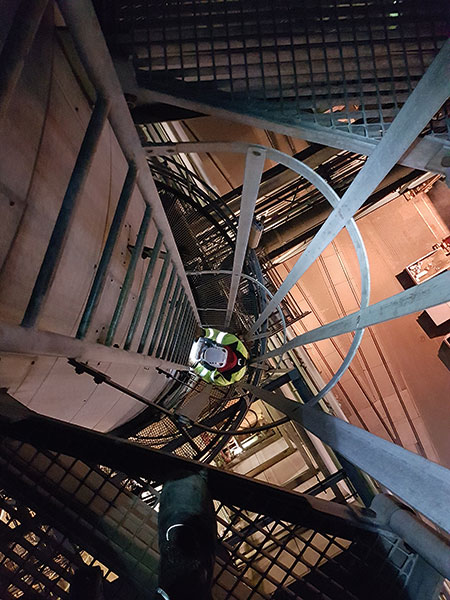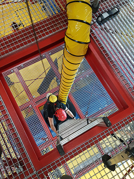Herzstück ist eine riesige Stahlbauanlage, rund 70 m lang, mit zwei begehbaren Etagen, Brücke und Rohrmast. Das gesamte Innenleben wurde von IKB-Mitarbeitern geplant und entworfen, die mit viel Leidenschaft und Erfahrung laut Harbig alles darangesetzt haben, möglichst viel Realität auf die Übungsanlage zu bringen und das gesamte Spektrum für exponiert arbeitendes Personal widerzuspiegeln. Durch die Stützen der Stahlkonstruktion führt eine knapp 20 m lange Röhre – eine laut Toni Harbig einzigartige Kanalsimulationsanlage_ »Damit sind wir anderen Ausbildungsbetrieben meilenweit voraus.«