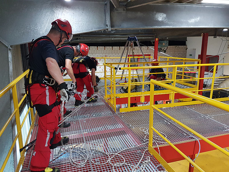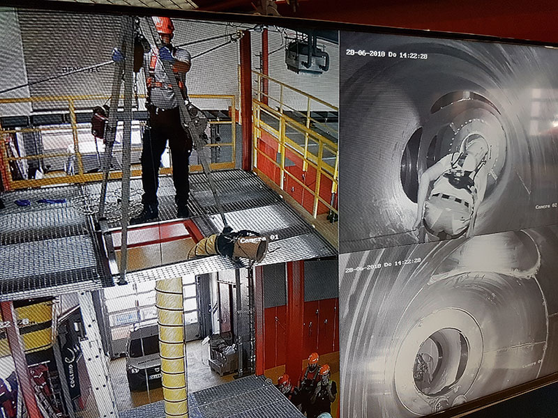 Die »Confined Space«-Trainingsanlage für Training auf engstem Raum über Einstiege in unterschiedlichen Durchmessern lässt sich während des Trainings teilweise mit Wasser fluten, künstlich vernebeln oder mit Flackerlicht bespielen. Szenarien wie beispielsweise eine Kanalrettung können alle anderen Teilnehmer über vier Kameras ohne Absturzgefahr am Mannloch und bei bester Sicht auf einer Videoüberwachungsanlage betrachten. Die Kameras der HD-Videoanlage können auch Infrarot- oder Thermobilder anzeigen oder aufzeichnen.