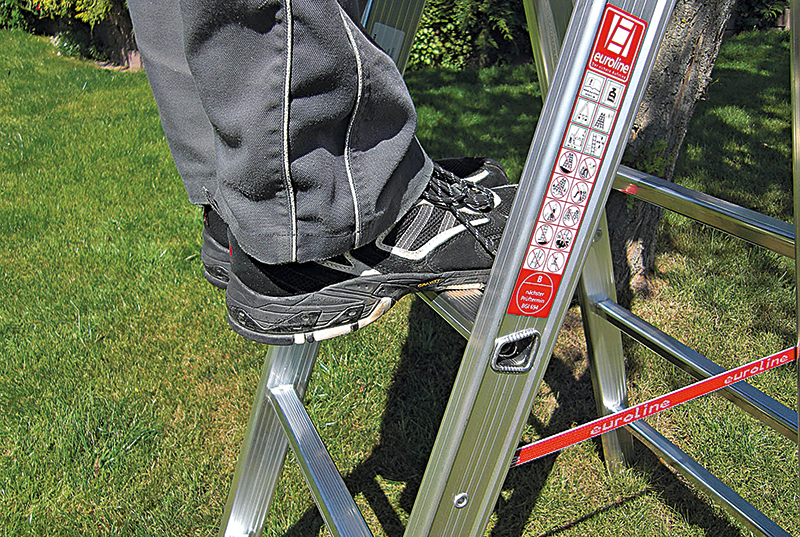 Zudem setzt Hersteller Euroline bei seinen Produkten standardmäßig auf weitere Sicherheitsmerkmale wie stabile Beschläge und Anbauteile mit Sicherheitsverschraubung (M8) sowie hochwertige, rutschfeste und fest am Holm montierte Leiterschuhe. Als zusätzliche Sicherung erlaubt die Anti-Rutschmatte den sicheren Einsatz auf sonst ungeeigneten Untergründen.