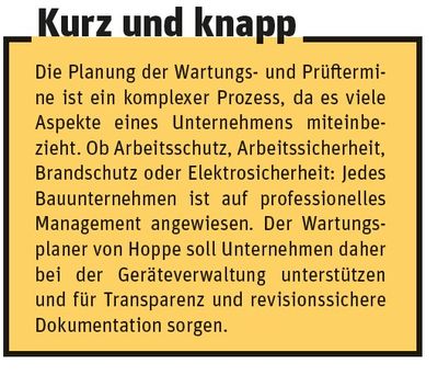 Bauingenieur Peter Preis, Berater der Hoppe Unternehmensberatung, empfiehlt eine Inventarverwaltung, in der die Maschinen, Geräte und Werkzeuge inventarisiert werden. Um den Überblick zu bewahren und jederzeit das gewünschte Arbeits- oder Betriebsmittel in funktionsfähigem Zustand zur Verfügung zu haben, ist ein gutes Management der Betriebsmittel unerlässlich – vor allem wenn der Bestand an Werkzeugen, Maschinen und Geräten im Unternehmen groß ist. Daher kann eine digitale Werkzeugverwaltung zum Beispiel einfach anzeigen, welches Werkzeug momentan auf welcher Baustelle eingesetzt wird.