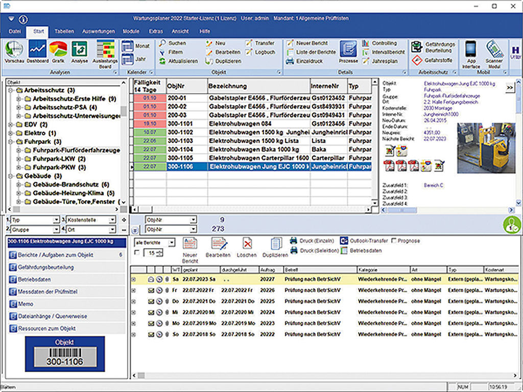 Darüber hinaus müssen auch die nächsten Prüftermine der Arbeitsmittel nachverfolgt werden. Diese sind für den Arbeitsschutz unerlässlich, denn nur so kann garantiert werden, dass das eingesetzte Arbeits- oder Betriebsmittel voll funktionsfähig ist und kein Verletzungsrisiko besteht. Welche Anforderungen dabei gestellt werden, ist durch Gesetze, Richtlinien und Verordnungen geregelt. Zu beachten ist jedoch, dass die Wartungs- und Prüfvorschriften mitunter für jedes Baugerät bzw. jeden Betriebsgegenstand unterschiedlich sein können. Ebenso muss eine rechtssichere Dokumentation über die Prüfung der Arbeitsmittel erfolgen.