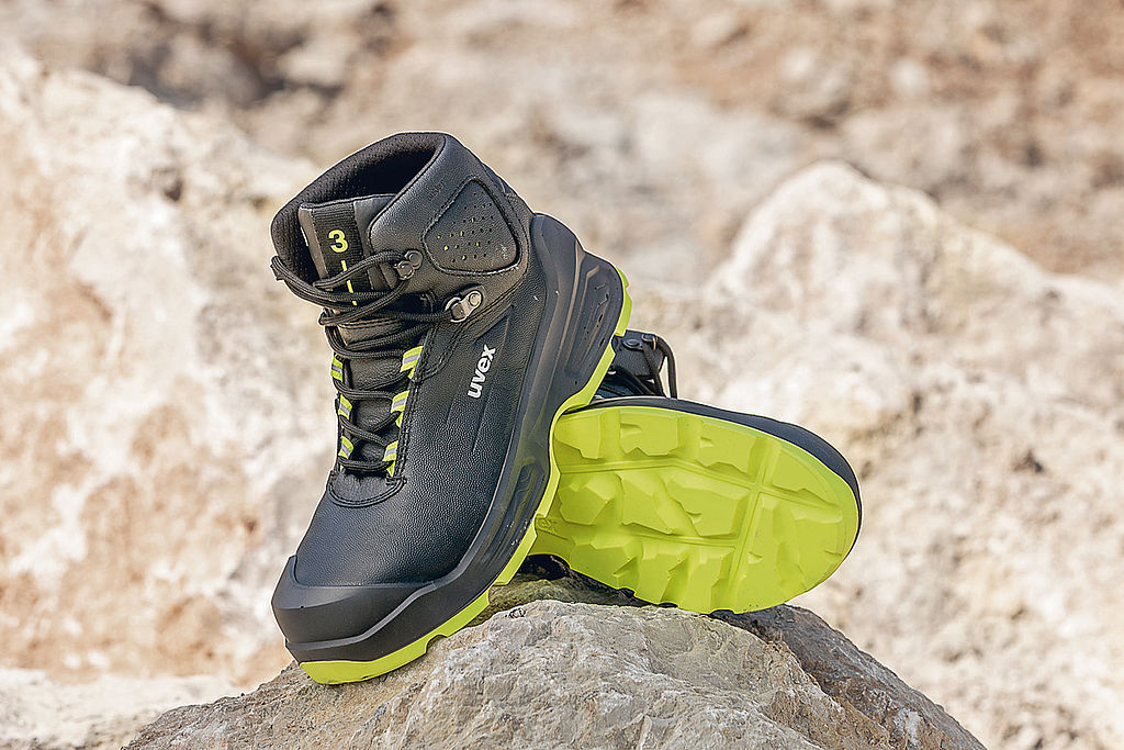 Um die Biomechanik des Körpers gemäß des »uvex bionom x«-Prinzips zu unterstützen, wurden feine Streben in die Sohle integriert. Gemeinsam mit dem grobstolligen Profil, das über selbstreinigende Eigenschaften verfügt, könne so auch über längere Zeiträume hinweg ein angenehmes Tragegefühl gewährleistet werden. Zusätzlich schützt der Schuh vor eindringender Nässe und sorgt so nochmals für hohen Komfort: Die spezielle »uvex waterstop«-Technologie verleiht dem »uvex 3« viermal höhere Werte, als von der Wasserdurchtritts- und aufnahme-Prüfung vorgegeben, so Uvex. Zudem bietet der Sicherheitsschuh auch auf nassen Untergründen eine optimale Rutschhemmung, sodass das Risiko für Rutschunfälle effektiv minimiert werden kann. Neben der Sohle bietet außerdem der spezielle Schaum im »uvex anklepro« zusätzliche Sicherheit, indem er den Träger vor schmerzhaften Stoßeinwirkungen im Knöchelbereich schützt.
