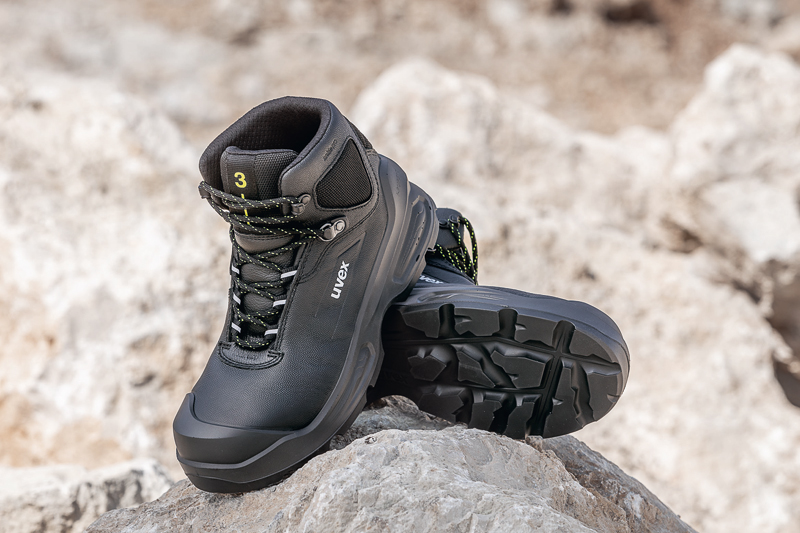 Als Grundlage für die Entwicklung neuer Schuhe wie dem »uvex 3« dienen Prinzipen wie das sogenannte »uvex bionom x«: Dabei handelt es sich um eine strukturierte Herangehensweise, die bei der Erstellung neuer Produkte die biomechanischen Funktionsweisen des Körpers mit den Funktionsweisen des Schuhwerks verbindet und so eine harmonierende Einheit aus Körper, Schuhwerk und Umwelt schafft. Das Unternehmen hierzu in einem Statement: »Nur wenn der Körper seine maximale Leistungsfähigkeit erreicht, kann er optimal vor Verletzungen schützen.« Das System »uvex bionom x« wurde zusammen mit dem Experten für Biomechanik Dr. Caleb Wegener der uvex safety group in Australien entwickelt. Am »uvex 3« ist es beispielsweise von außen an der Sohle erkennbar: Feine Streben durchziehen die Sohle und unterstützen die Biomechanik. Zusammen mit dem grobstolligen, selbstreinigenden Profil soll der »uvex 3« dem Anwender ein ausgezeichnetes Tragegefühl bieten.