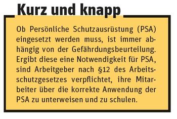 In jedem Fall gilt: Wenn die Gefährdungsbeurteilung ergibt, dass PSA zum Einsatz kommen muss, ist eine entsprechende Unterweisung durchzuführen, damit die bestmöglichen Schutzvoraussetzungen erfüllt werden. Dies trifft insbesondere auch auf die Nutzung von Atemschutz zu: Personen, die die Unterweisungen durchführen, müssen die nötigen Kenntnisse in einem Lehrgang an einer entsprechenden Ausbildungseinrichtung (z. B. Ausbildungsstätten der Versicherungsträger, Feuerwehrschulen, Herstellern von Atemschutzgeräten) erwerben und sich regelmäßig fortbilden. Die Ausbildungsvoraussetzungen und Inhalte sind im DGUV-Grundsatz 312-190 beschrieben. Aber auch der Umgang mit besonderer PSA – wie PSAgA – bedarf einer entsprechenden Unterweisung, gerade weil Mitarbeiter in der Lage sein müssen, einem verunfallten Kollegen im Ernstfall Erste Hilfe leisten zu können.