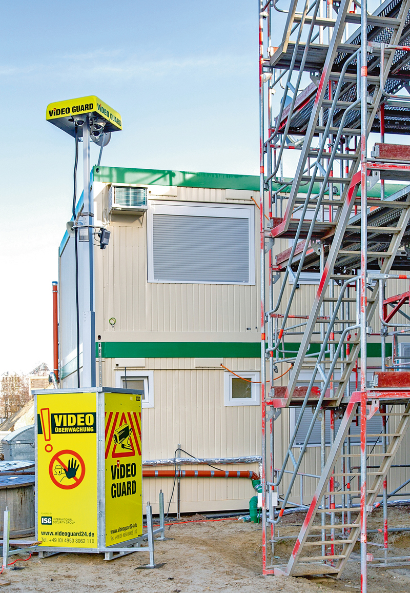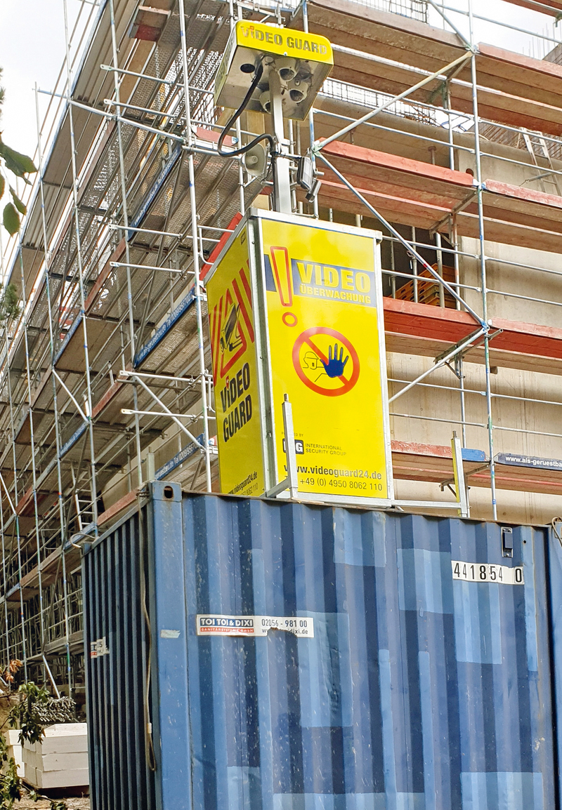 Verstärkt setzen Bauunternehmen daher auf eine kamerabasierte Bewachung des Containers. Systeme wie »Video Guard Professional« überzeugen durch eine baustellentaugliche Hardware, die sich als langlebig und robust erweist. Hinzu kommen außerdem eine intelligente Software, die zuverlässig arbeitet und eine angeschlossene Alarmzentrale, welche im Fall der Fälle punktgenau und professionell reagiert. So ist der Tower mit seinen integrierten Kameras und Lautsprechern ideal auf die Situationsbedingungen einer Baustelle ausgelegt.