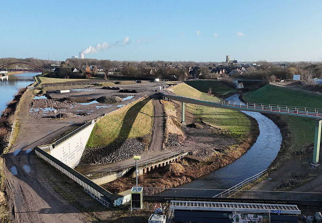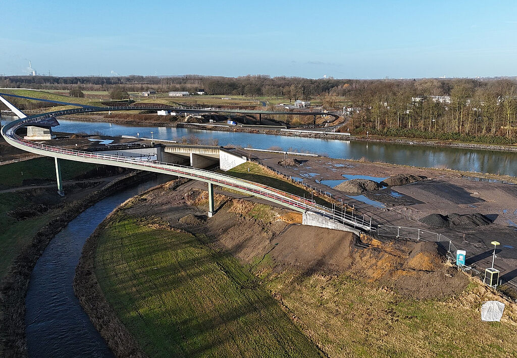 In Auftrag gegeben wurde die Brücke von der Emschergenossenschaft. Die Planungsgemeinschaft von Schüßler-Plan, DKFS Architects und Smeets Landschaftsarchitekten konnte sich im Rahmen eines internationalen Realisierungswettbewerbs durchsetzen und erhielt Ende 2019 den Zuschlag für die Durchführung. Der Baustart für das Megaprojekt erfolgte im April 2021. Die ARGE MCE / Bauunternehmung Gebr. Echterhoff GmbH & Co. KG begann mit dem Spezialtiefbau und dem Betonschalungsbau und sorgte so dafür, dass die Brücke ein sicheres Fundament bekommt. Ein so bedeutendes Bauvorhaben zieht immer wieder eine große Aufmerksamkeit auf sich. Leider auch das Interesse von Dieben, Vandalen oder unbefugten Gästen, die sich auf der Baustelle zu schaffen machen und sich dabei oftmals selbst in Gefahr begeben. Daher mussten umfangreiche Maßnahmen für das Sicherheitskonzept entwickelt werden, um Eindringlinge vom Betreten abzuhalten und den Baufortschritt nicht zu gefährden.