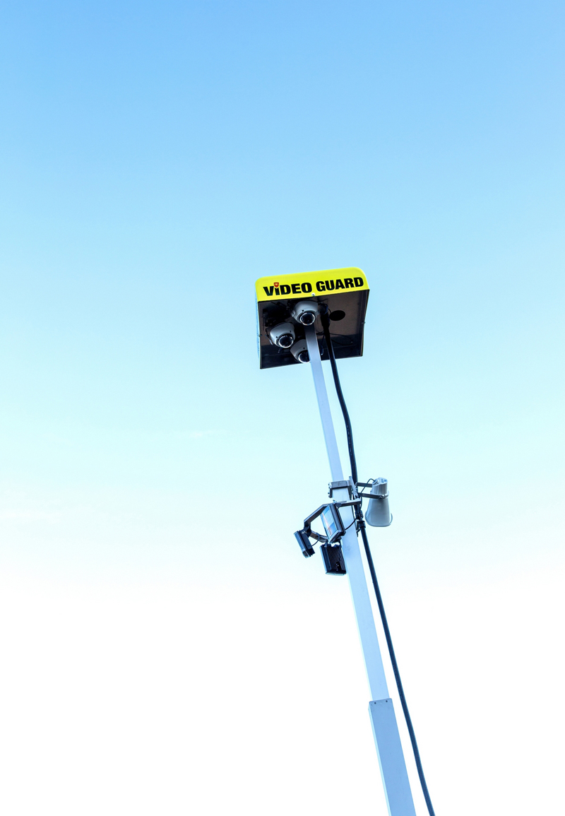 Die Überwachungstürme lassen sich auf bis zu sechs Meter herausfahren und sorgen bereits durch ihre Größe und das Erscheinungsbild für Abschreckung. Durch die auffälligen Signalfarben der Türme in einem kräftigen Gelb und einem warnenden Rot sind diese bereits aus der Distanz erkennbar. Eine Aufschrift, welche die Videoüberwachung deutlich macht sowie Piktogramme sorgen zusätzlich für eine unmissverständliche Kommunikation und mahnen unbefugte Personen vor dem Betreten des Grundstückes.