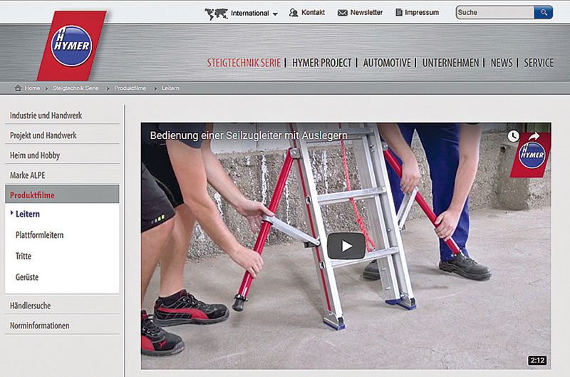 Alle Videoanleitungen von Hymer-Leichtmetallbau finden sich unter www.hymer-alu.de/steigtechnik-serie/produktfilme/leitern.html.