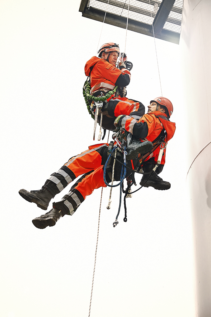 Um die Sicherheit der Kollegen am Boden zu gewährleisten, sind alle Taschen mit Reißverschluss und Klettverschluss doppelt gesichert. Schrauben, Werkzeug und andere Utensilien können somit nicht herausfallen und stellen keine Gefahr für die Bodenunterstützung dar. Denn eine Schraube, die aus circa 75 m Höhe fällt, kann tödlich sein. Neben dem praktischen Charakter der Kleidung soll unter anderem auch das körperliche Wohl der Arbeiter berücksichtigt werden. Der Hersteller möchte daher, dass sich der Arbeiter wohl in der Kleidung fühlt und keinerlei Kompromisse eingehen muss. So sei beispielsweise das körperliche Wohl des Trägers mit dem Design kombiniert und ermögliche so die Atmungsaktivität und Temperaturregulierung des Körpers. Der atmungsaktive (4000 g/m2), wasserdichte (Wassersäule: 8000 mm) und windundurchlässige F120®-Stoff garantiere laut Hersteller einen effektiven Nässe- und Windschutz von außen und ermögliche die Atmungsaktivität und Temperaturregulierung des Körpers von innen. J
