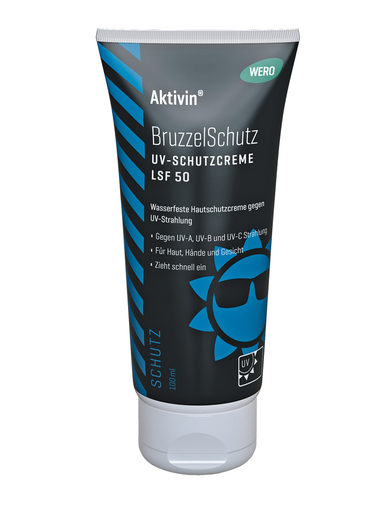 Als Outdoorworker sind Bauarbeiter ständig der UV-Strahlung ausgesetzt. Sowohl die natürliche Strahlung der Sonne wie auch künstliche Lichtquellen wie etwa Schweißlicht erhöhen das Risiko an weißem Hautkrebs zu erkranken. Bei Arbeiten unter natürlicher oder künstlicher UV-Strahlenbelastung sind daher Sonnenschutzprodukte mit ausreichendem Lichtschutzfaktor erforderlich. Wero hat hierfür den »Bruzzel Schutz« aus der »Aktivin«-Produktreihe entwickelt, der über einen Lichtsschutzfaktor 50 verfügt. Die UV-Schutzcreme ist nach Angaben des Herstellers wasserfest und schützt vor UV-A-, UV-B- und UV-C-Strahlung.