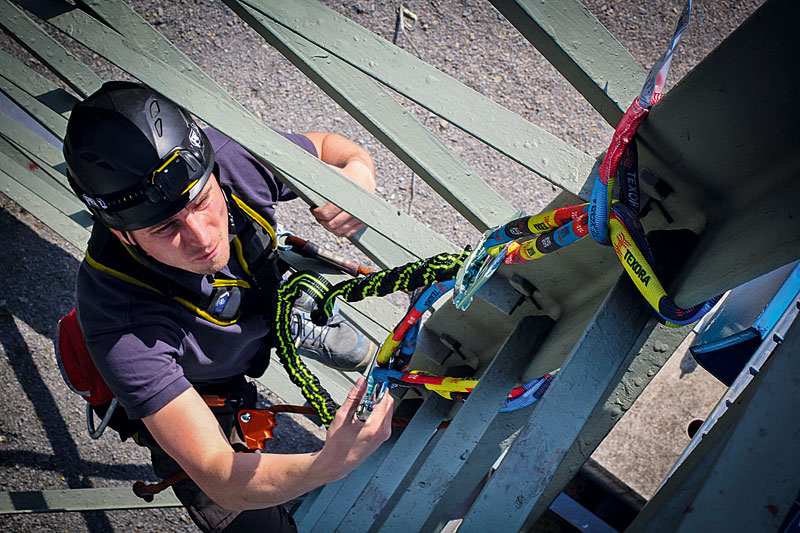 Schönberg benutzt die Texora-Schlinge bei jeder Schulung zum Aufbau einer Redundanz für seine Teilnehmer: »Sowohl als Verbindungs- wie auch als Anschlagmittel in Rettungsausrüstungen garantiert mir die Schlinge eine sehr einfache Handhabung, vor allem durch die Anwendung im Schnürgang«, resümiert der PSA-Experte.
