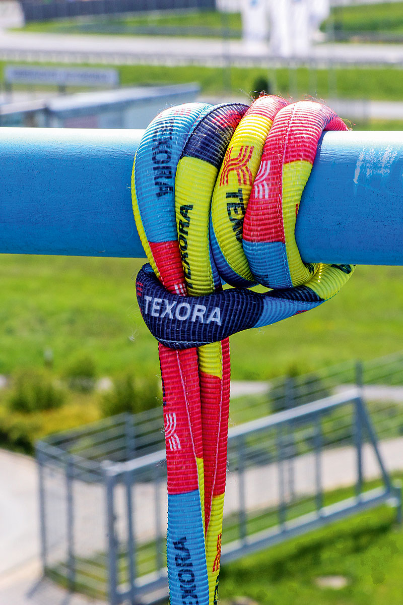 Im Vergleich zu den anderen Lösungen ist der verwendete tragende Werkstoff hier kein gewebtes Bandmaterial, es handelt sich vielmehr um einzelne Kernfäden, die von einer robusten Textilhülle umgeben sind. Der Aufbau entspricht daher mehr einer typischen Polyesterrundschlinge als einer üblichen Bandschlinge, was zu einer enormen Bruchfestigkeit der Texora-Schlinge von über 100 kN führt. Damit sei, so die Anbieter, selbst bei ungünstigen Einbauverhältnissen, beispielsweise durch Ankerstich, noch eine sehr hohe Festigkeit vorhanden. Außerdem ist die Texora-Anschlagschlinge mit rund 80 g bis 160 g (je nach Länge) sehr leicht und flexibel.