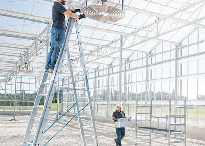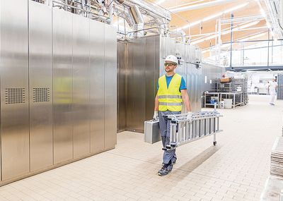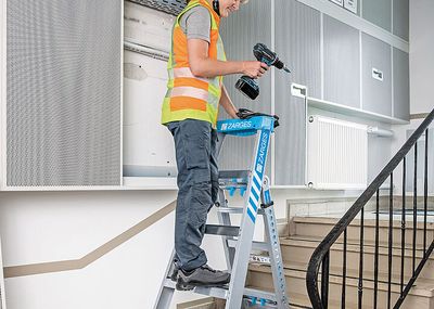 Die drei neuen Modelle decken folgendes Spektrum ab: Die »Masterflex Plus« ist mit einer Arbeitshöhe von 5 m die größte Arbeitsplattform und daher für Arbeiten in großer Höhe – z. B. an Decken auf Treppen oder schwer zugänglichen Stellen – prädestiniert. Sie verfügt über Stufen und eine automatische Saloontür. Mit der »ZAP Masterflex« stellt Zarges ein Modell vor, das sich auch für die Arbeit auf Treppen eignet. Wie bei der »ZAP Masterflex Plus« lässt sich auch hier die Höhe flexibel und schnell anpassen. Die ausziehbaren Stützten sorgen für einen sicheren Stand. Sie bietet eine Arbeitshöhe von bis zu 4,30 m und besitzt Sprossen statt Stufen sowie eine einefache Schrankentür. Die dritte Arbeitsplattform, die »ZAP Safemaster Max«, eignet sich insbesondere für Bau und Handwerk: Zweihändige Arbeiten können durch die Sicherheits-Saloontür schnell und einfach durchgeführt werden. Die Arbeitshöhe liegt bei bis zu 3,70 m. Alle drei Plattformen erfüllen die Sicherheitskriterien nach EN 131-7.